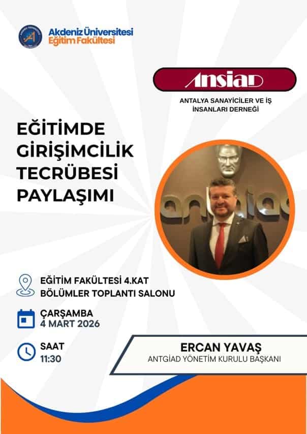 Etkinlik, Antalya Sanayici ve İş İnsanları Derneği (ANSİAD) ile iş birliği içinde, Eğitim Fakültesi 4. Kat Bölümler Toplantı Salonu’nda düzenlendi. Seminere, Antalya Genç İş İnsanları Derneği (ANTGİAD) Yönetim Kurulu Başkanı Ercan Yavaş konuşmacı olarak katıldı ve geleceğin eğitimcileriyle buluştu.