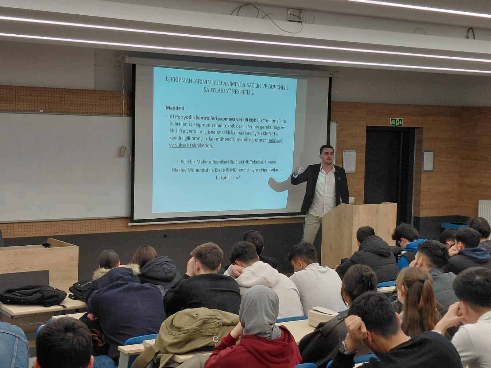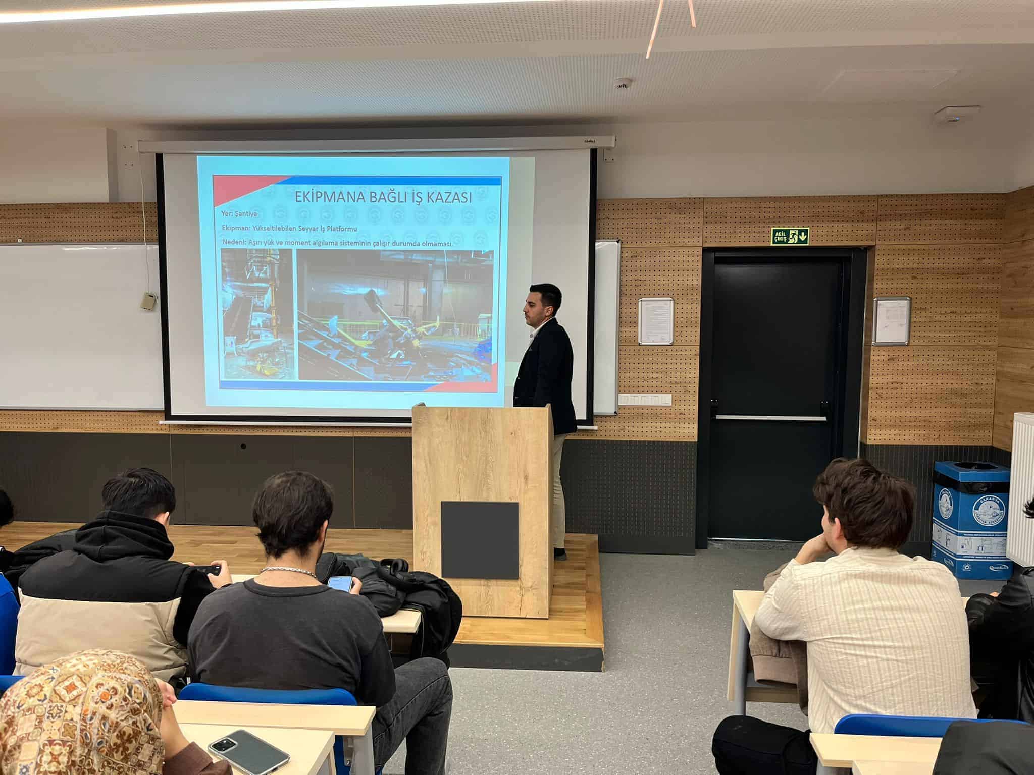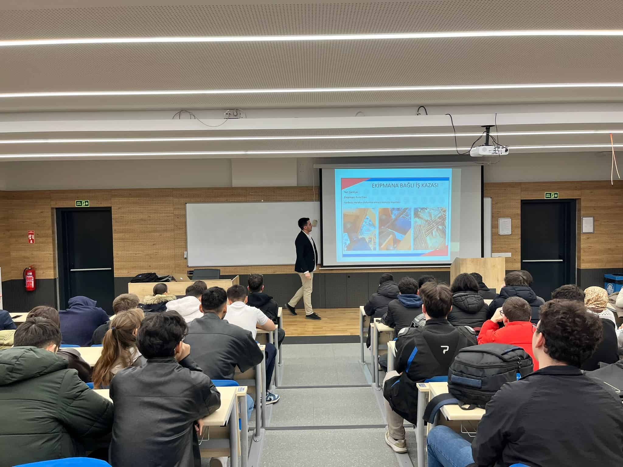 Etkinlikte, Ada Periyodik Kontrol ve Muayene Hizmetleri firma sahibi Muhlis Can Özel, öğrencilerimizle bir araya gelerek periyodik kontrol süreçlerinin yasal boyutu, iş güvenliği açısından önemi ve sektör uygulamaları hakkında kapsamlı bilgiler paylaştı. Gerçek saha deneyimlerinden örnekler aktararak öğrencilerimize mesleki hayatta karşılaşabilecekleri uygulamalar hakkında önemli değerlendirmelerde bulundu.
