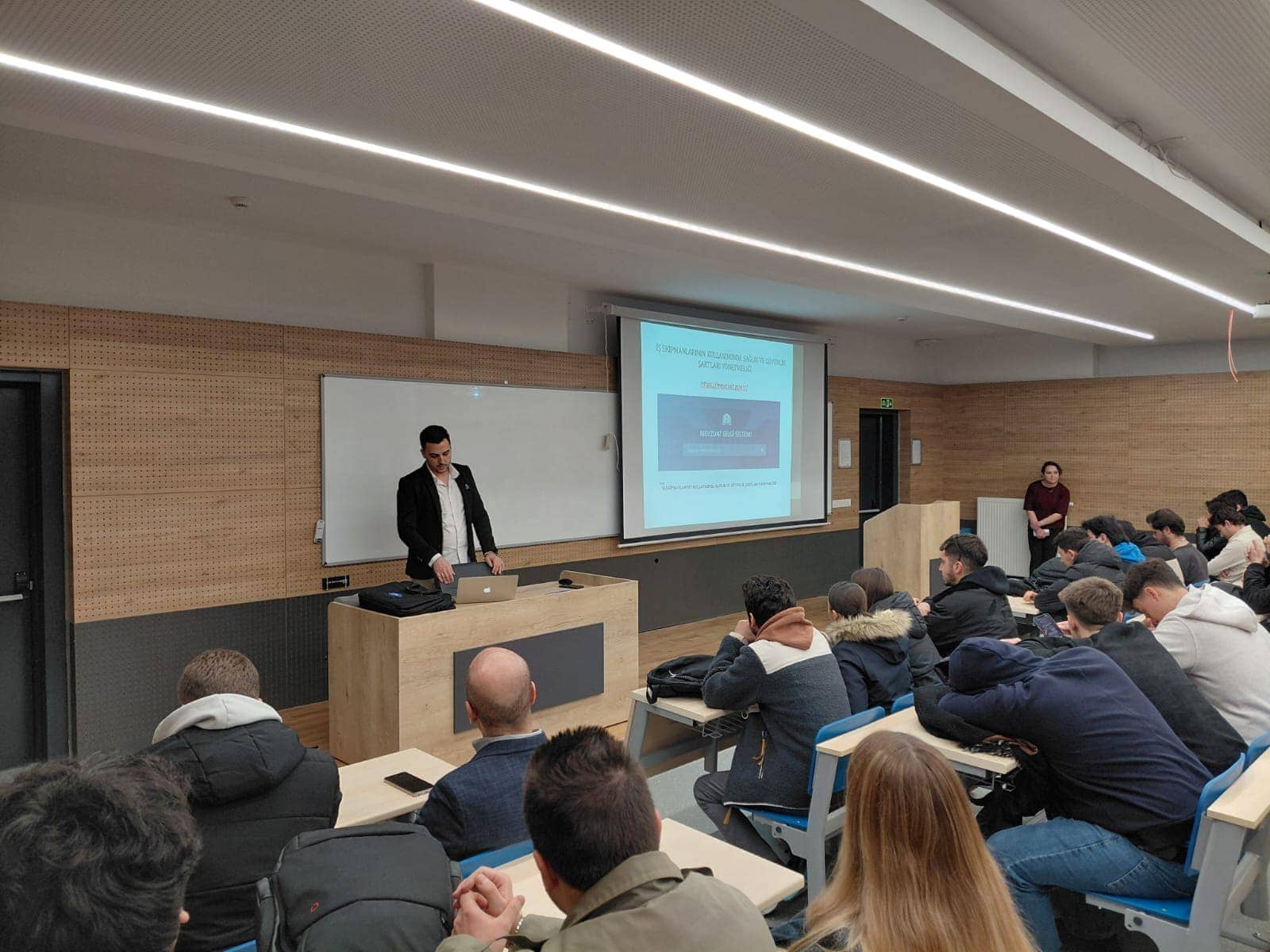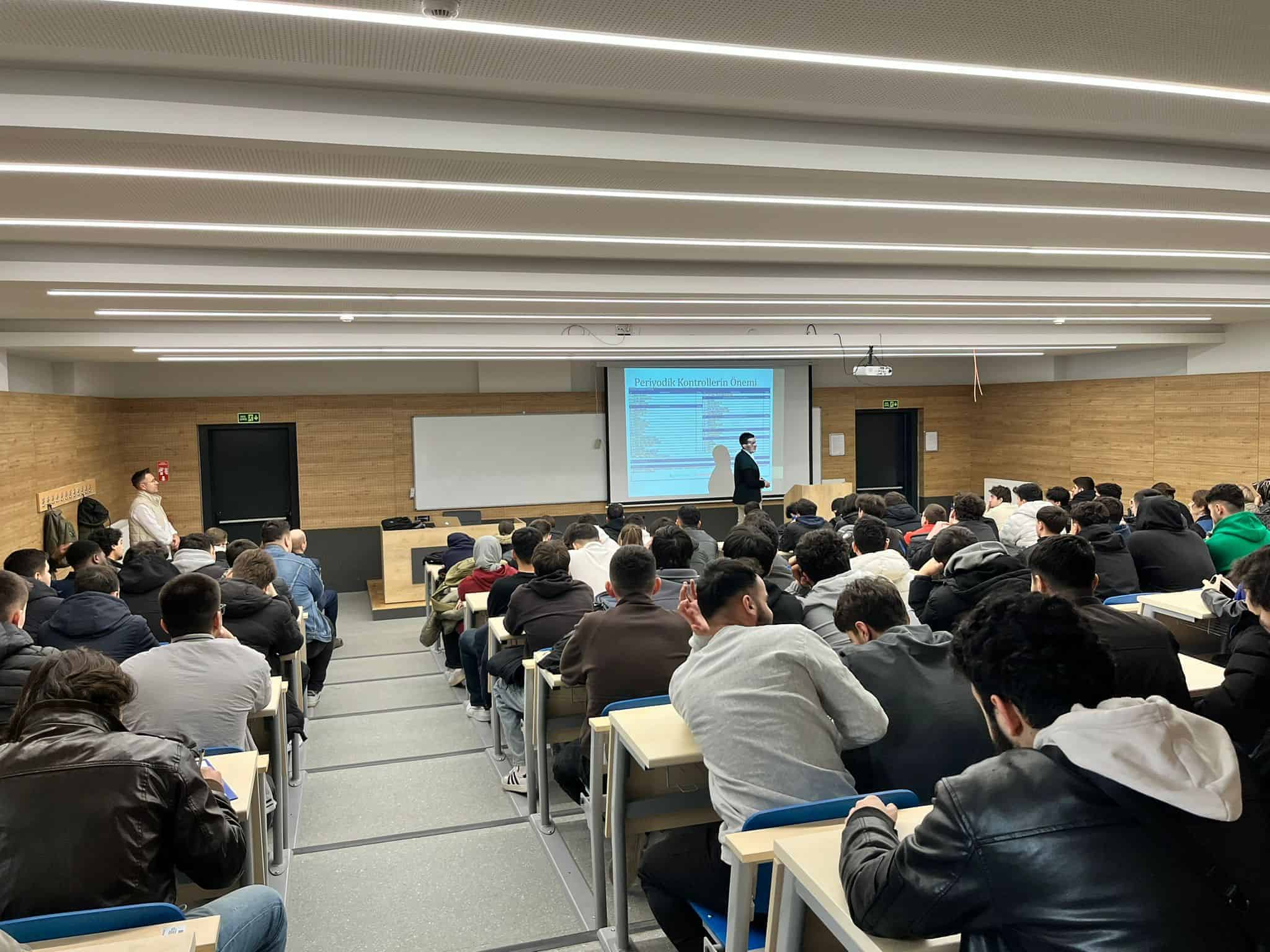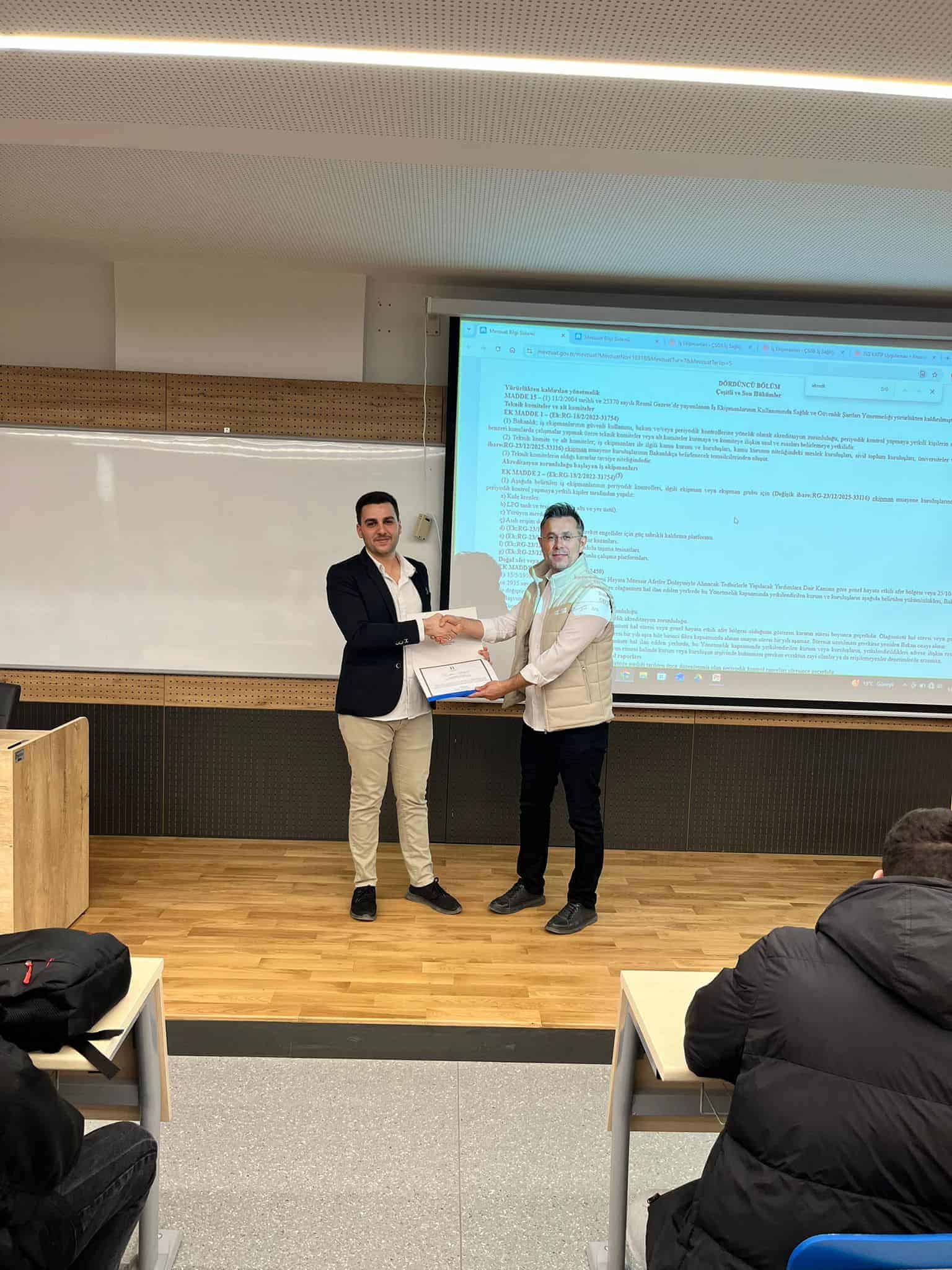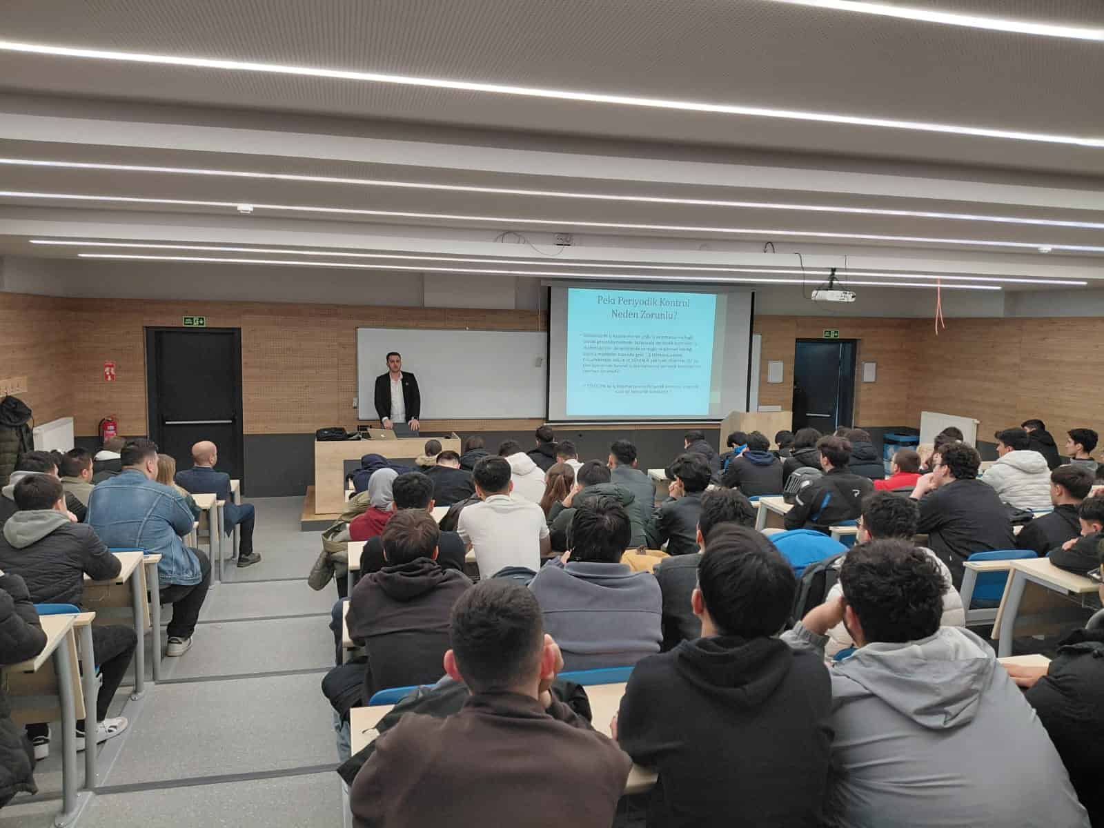 Etkinlikte, Ada Periyodik Kontrol ve Muayene Hizmetleri firma sahibi Muhlis Can Özel, öğrencilerimizle bir araya gelerek periyodik kontrol süreçlerinin yasal boyutu, iş güvenliği açısından önemi ve sektör uygulamaları hakkında kapsamlı bilgiler paylaştı. Gerçek saha deneyimlerinden örnekler aktararak öğrencilerimize mesleki hayatta karşılaşabilecekleri uygulamalar hakkında önemli değerlendirmelerde bulundu.
