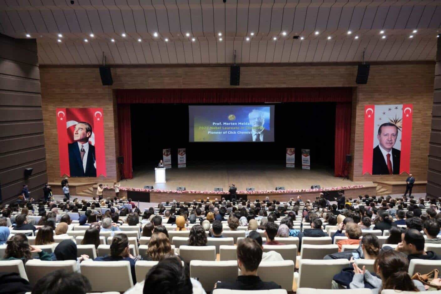 Prof. Meldal, bakır katalizli azit-alkin siklokatılma (CuAAC) reaksiyonunun keşfi ve geliştirilmesindeki rolünü, bilimsel yolculuğunu ve klik kimyasının sağlık ve malzeme bilimi gibi alanlardaki etkilerini gençlerle paylaştı. Etkinliğe binin üzerinde kişi katıldı.