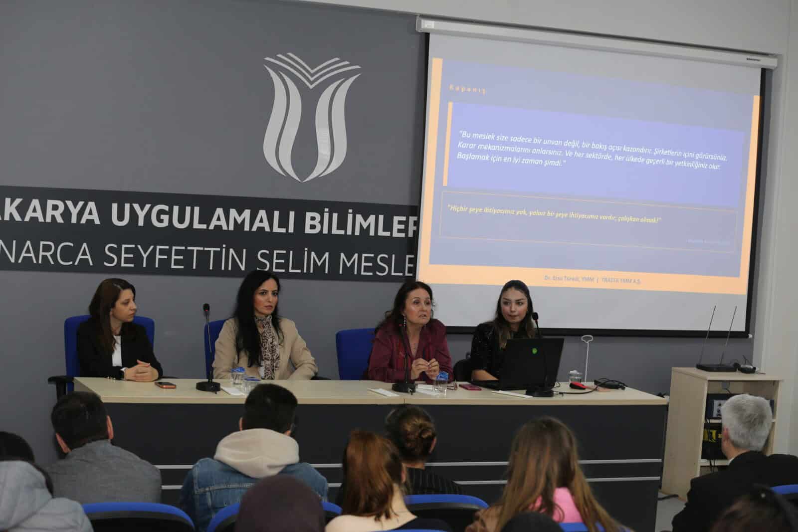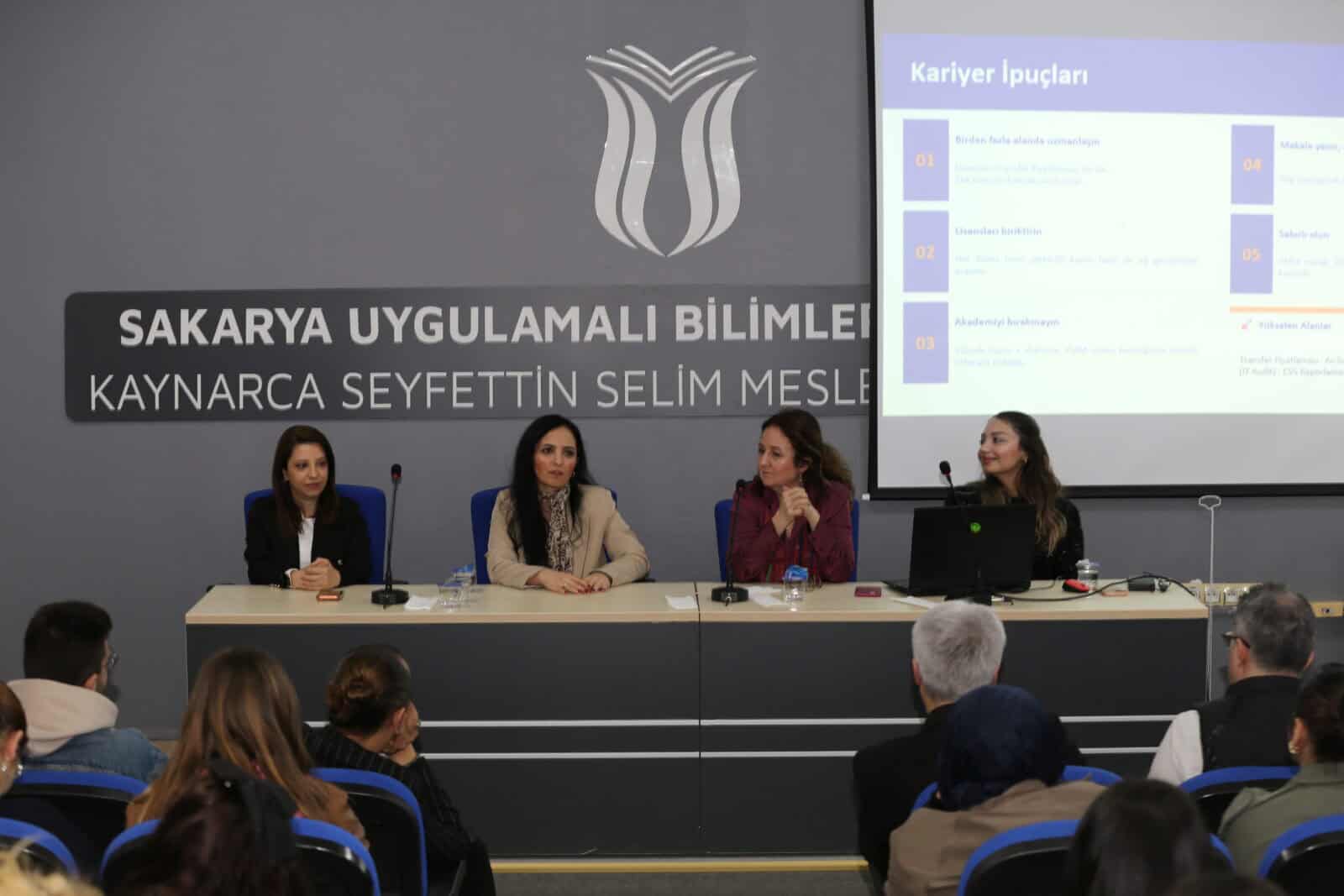 Kaynarca MYO mezunlarından Denetçi Yardımcısı Sude Yavuz ile Muhasebe Müdürü ve SMMM Tuğçe Yıldırım Ekmekçi, mezuniyet sonrası yaşadıkları süreçleri anlatarak öğrencilere rehberlik etti. Sektörde karşılaşılan fırsatlar ve zorluklar hakkında samimi paylaşımlarda bulunan konuşmacılar, öğrenciler için yol gösterici tavsiyelerde bulundular.