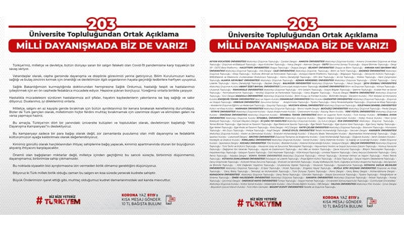 Türkiye’nin dört bir yanında bulunan 203 üniversite öğrenci topluluğu ve kulübü, Koronavirüsle mücadele için Cumhurbaşkanı Sayın Recep Tayyip Erdoğan’ın ‘Biz bize yeteriz...
