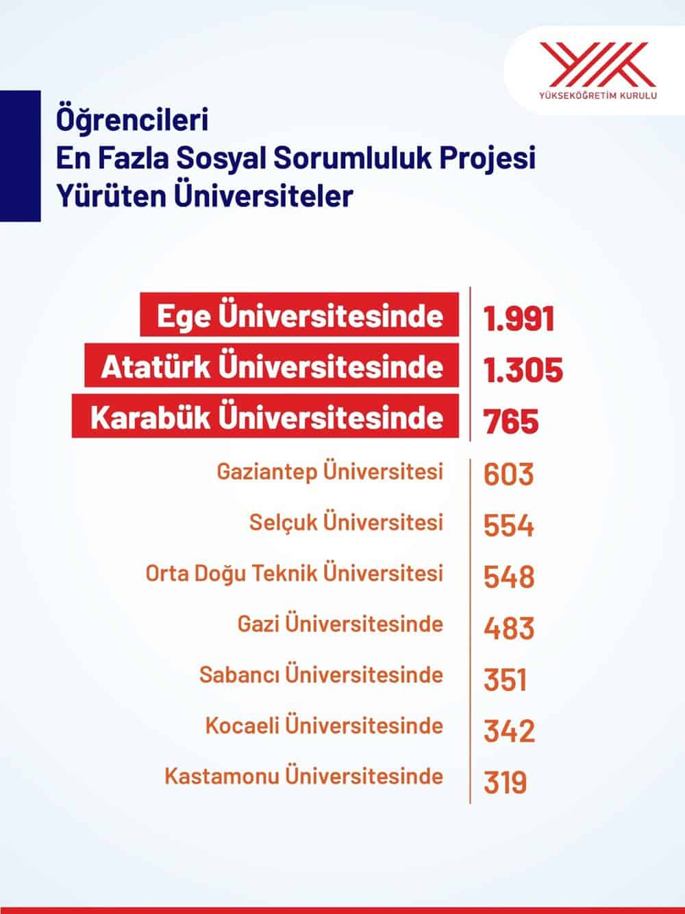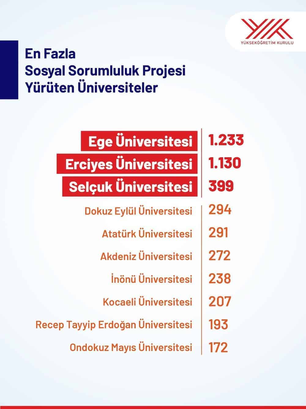 Raporda, 123 üniversitenin 5 bin 839 projeyi hayata geçirdiği vurgulandı. Bu projelerin 5 bin 427’si devlet üniversitelerinde, 412’si ise vakıf üniversitelerinde gerçekleştirildi. Ege Üniversitesi 1.233, Erciyes Üniversitesi 1.130 ve Selçuk Üniversitesi 399 projeyle en fazla sosyal sorumluluk projesine sahip ilk üç üniversite oldu.