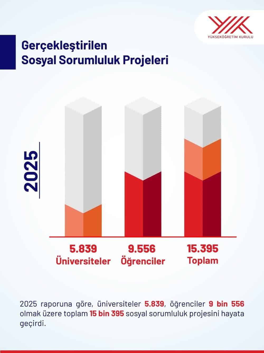 Yükseköğretim Kurulu tarafından yayımlanan 2025 Üniversite İzleme ve Değerlendirme Genel Raporu’na göre, Türkiye’deki üniversiteler ve öğrencileri 2024 yılında toplam 15 bin 395 sosyal sorumluluk projesine imza attı.