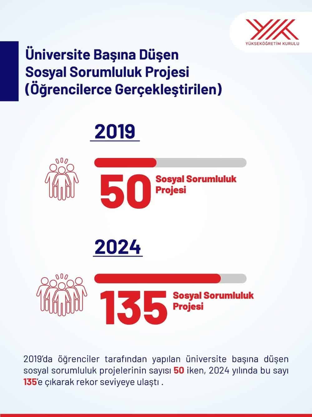 Öğrenciler tarafından yürütülen projelerde de dikkate değer bir artış gözlendi. 2024 yılında 71 üniversitede öğrenciler toplamda 9 bin 556 sosyal sorumluluk projesi gerçekleştirdi. Son beş yılda öğrenci projelerinde ciddi bir artış yaşanırken, 2019’da üniversite başına 50 olan proje sayısı 2024’te 135’e yükselerek yeni bir rekor kırdı.